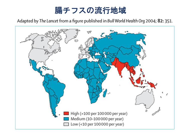 チフス菌(Salmonella enterica serotype)による感染症で、菌に汚染された飲食物の経口感染で起こります。日本国内では、患者数の少ない感染症ですが、海外では毎年2500万人以上が罹患しています。
